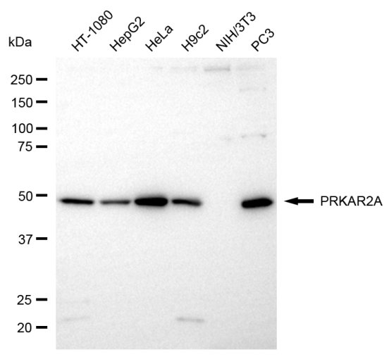 Western blotting analysis using PRKAR2A antibody. Total cell lysates (30 μg) from various cell lines were loaded and separated by SDS-PAGE. The blot was incubated with PRKAR2A antibody and HRP-conjugated goat anti-rabbit secondary antibody respectively.