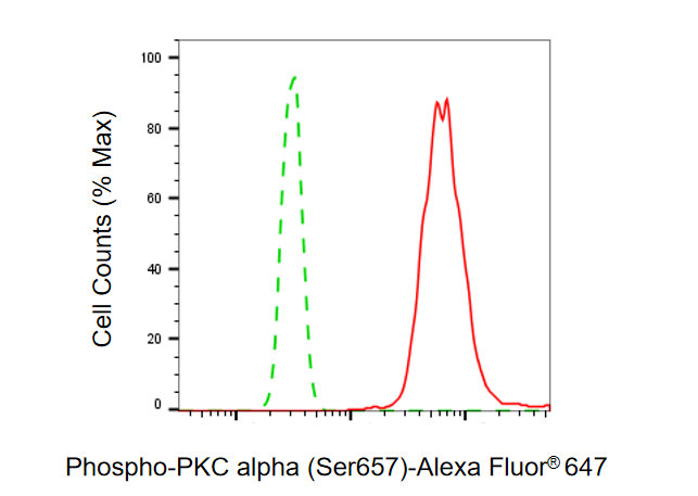Flow cytometric analysis of Phospho-PKC alpha (Ser657) expression in HT-1080 cells using Phospho-PKC alpha (Ser657) antibody. Green, isotype control; red, Phospho-PKC alpha (Ser657).