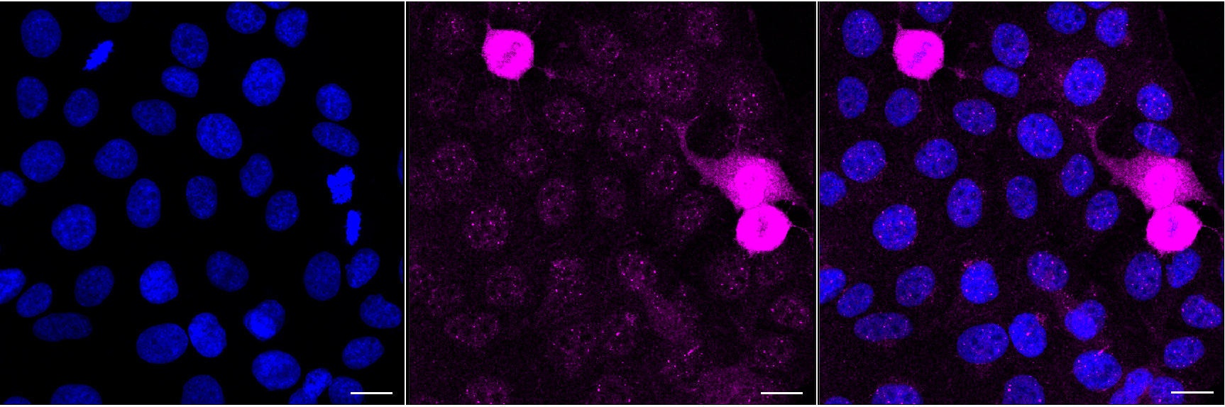 Immunocytochemical staining of HT-1080 cells with PRKCA antibody. Nuclei were stained blue with DAPI; PRKCA was stained magenta with Alexa Fluor? 647. Images were taken using Leica stellaris 5. Protein abundance based on laser Intensity and smart gain: High. Scale bar, 20 μm.