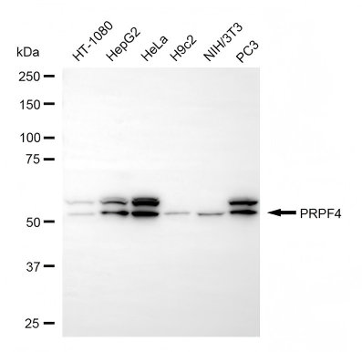 Western blotting analysis using PRPF4 antibody. Total cell lysates (30 μg) from various cell lines were loaded and separated by SDS-PAGE. The blot was incubated with PRPF4 antibody and HRP-conjugated goat anti-rabbit secondary antibody respectively.