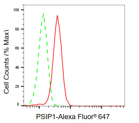 Flow cytometric analysis of PSIP1 expression in HeLa cells using PSIP1 antibody. Green, isotype control; red, PSIP1.
