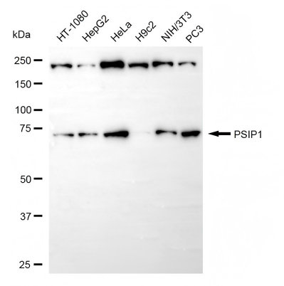 Western blotting analysis using PSIP1 antibody. Total cell lysates (30 μg) from various cell lines were loaded and separated by SDS-PAGE. The blot was incubated with PSIP1 antibody and HRP-conjugated goat anti-rabbit secondary antibody respectively.