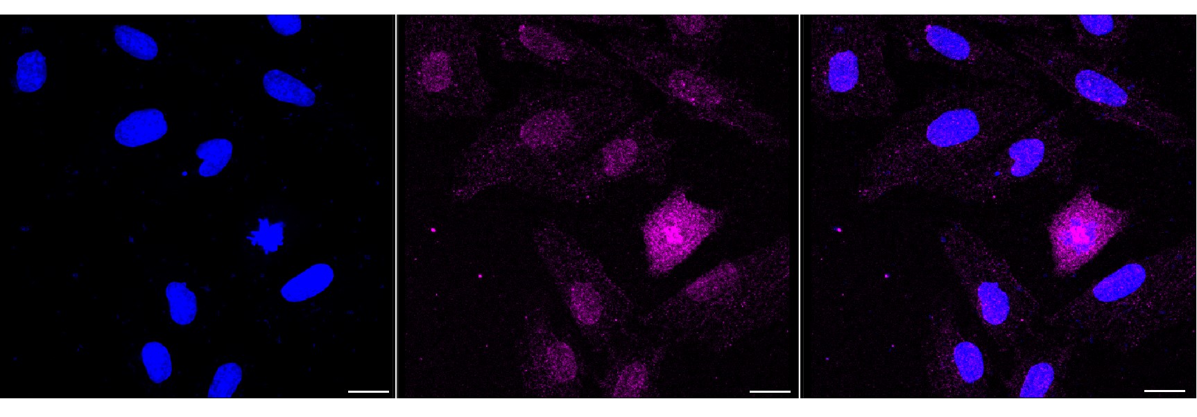 Immunocytochemical staining of H9c2 cells with PSMB10 antibody. Nuclei were stained blue with DAPI; PSMB10 was stained magenta with Alexa Fluor? 647. Images were taken using Leica stellaris 5. Protein abundance based on laser Intensity and smart gain: Medium. Scale bar, 20 μm.