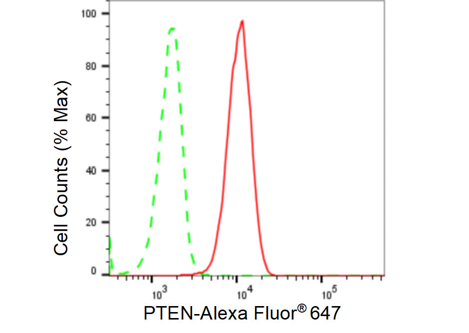 Flow cytometric analysis of PTEN expression in C2C12 cells using PTEN antibody. Green, isotype control; red, PTEN.