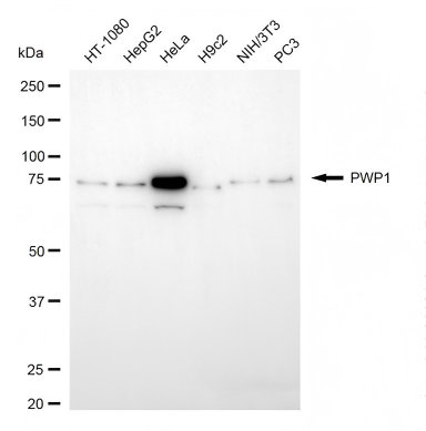 Western blotting analysis using PWP1 antibody. Total cell lysates (30 μg) from various cell lines were loaded and separated by SDS-PAGE. The blot was incubated with PWP1 antibody and HRP-conjugated goat anti-rabbit secondary antibody respectively.