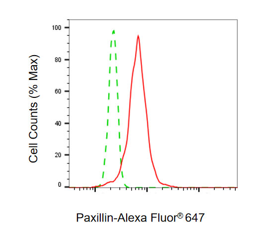 Flow cytometric analysis of Paxillin expression in HT-1080 cells using Paxillin antibody. Green, isotype control; red, Paxillin.