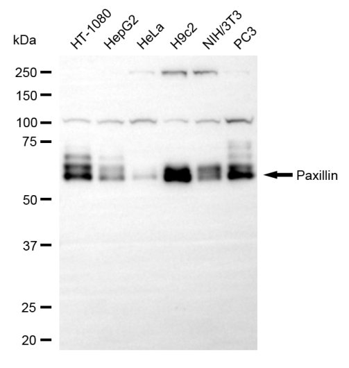 Western blotting analysis using paxillin antibody. Total cell lysates (30 μg) from various cell lines were loaded and separated by SDS-PAGE. The blot was incubated with paxillin antibody and HRP-conjugated goat anti-rabbit secondary antibody respectively.