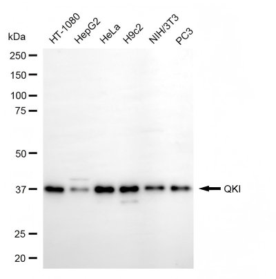 Western blotting analysis using QKI antibody. Total cell lysates (30 μg) from various cell lines were loaded and separated by SDS-PAGE. The blot was incubated with QKI antibody and HRP-conjugated goat anti-rabbit secondary antibody respectively.