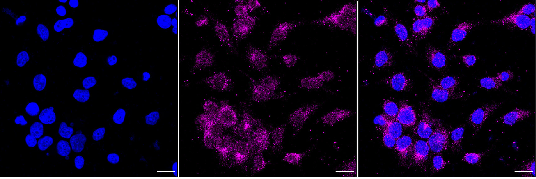 Immunocytochemical staining of HeLa cells with RAB4A antibody. Nuclei were stained blue with DAPI; RAB4A was stained magenta with Alexa Fluor? 647. Images were taken using Leica stellaris 5. Protein abundance based on laser Intensity and smart gain: Low. Scale bar, 20 μm.
