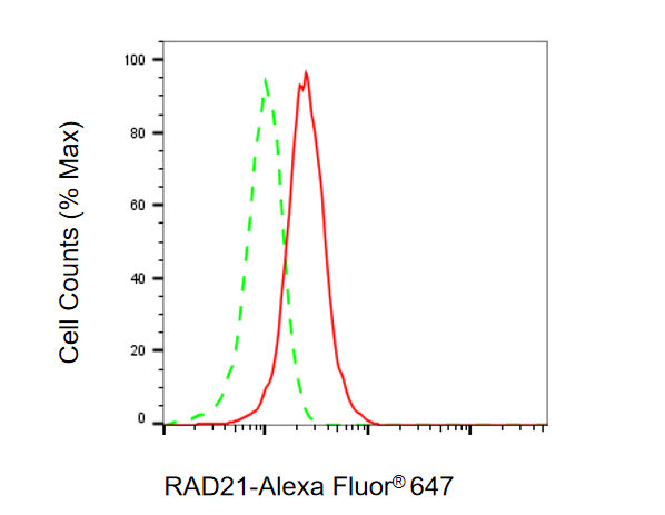 Flow cytometric analysis of RAD21 expression in HepG2 cells using RAD21 antibody. Green, isotype control; red, RAD21.