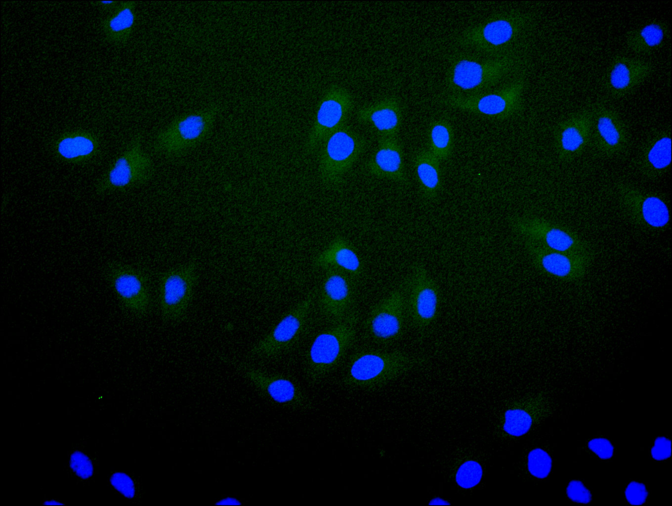 Immunofluorescence staining of Hela cell with CSB-RA019260MA1HU at 1:30 ,counter-stained with DAPI. The cells were fixed in 4% formaldehyde, permeabilized using 0.2% Triton X-100 and blocked in 10% normal Goat Serum. The cells were then incubated with the antibody overnight at 4°C. The secondary antibody was Fluorescein (FITC) AffiniPure Goat Anti-Human IgG, Fcγ fragment specific.