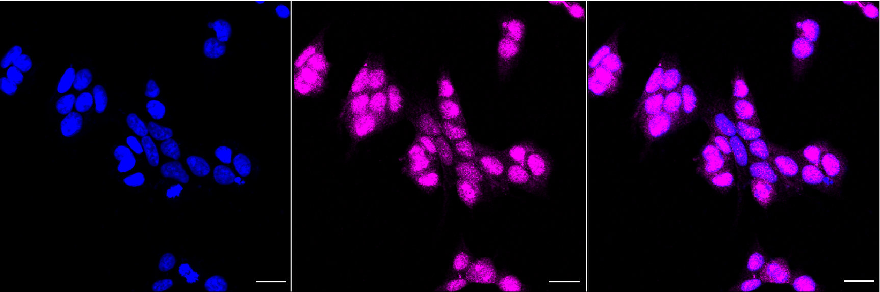 Immunocytochemical staining of HAP-1 cells with RAD51 antibody. Nuclei were stained blue with DAPI; RAD51 was stained magenta with Alexa Fluor? 647. Images were taken using Leica stellaris 5. Protein abundance based on laser Intensity and smart gain: High. Scale bar, 20 μm.