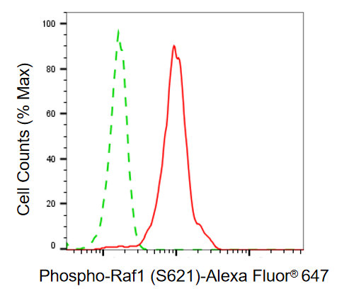 Flow cytometric analysis of phospho-Raf1 (S621) expression in HeLa cells using phospho-Raf1 (S621) antibody. Green, isotype control; red, phospho-Raf1 (S621).