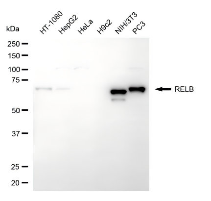 Western blotting analysis using RELB antibody. Total cell lysates (30 μg) from various cell lines were loaded and separated by SDS-PAGE. The blot was incubated with RELB antibody and HRP-conjugated goat anti-rabbit secondary antibody respectively.