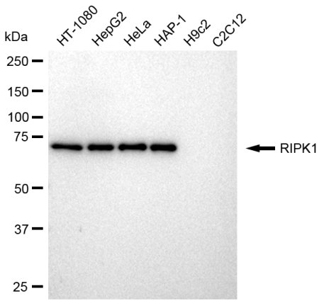 Western blotting analysis using RIPK1 antibody. Total cell lysates (30 μg) from various cell lines were loaded and separated by SDS-PAGE. The blot was incubated with RIPK1 antibody and HRP-conjugated goat anti-rabbit secondary antibody respectively. RIPK1, receptor interacting serine/threonine kinase 1.