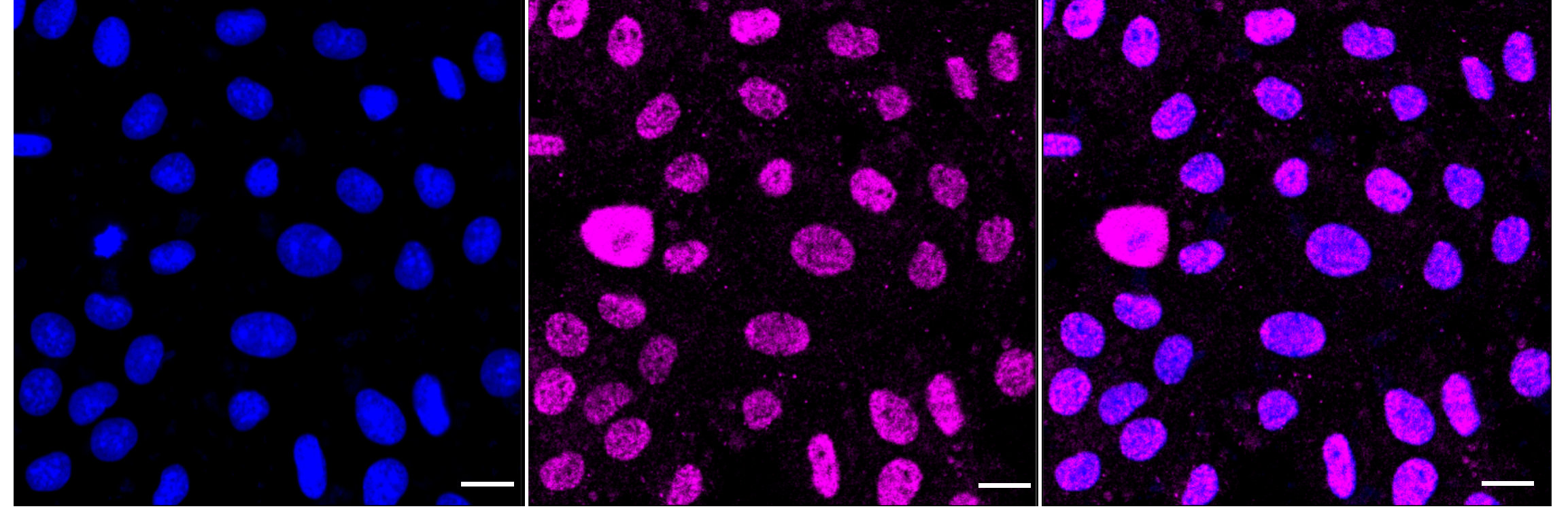 Immunocytochemical staining of H9c2 cells with Phospho-MSK1 (S376) antibody. Nuclei were stained blue with DAPI; Phospho-MSK1 (S376) was stained magenta with Alexa Fluor? 647. Images were taken using Leica stellaris 5. Protein abundance based on laser Intensity and smart gain: Low. Scale bar: 20 μm.
