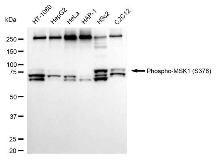 Western blotting analysis using Phospho-MSK1 (S376) antibody. Total cell lysates (30 μg) from various cell lines were loaded and separated by SDS-PAGE. The blot was incubated with Phospho-MSK1 (S376) antibody and HRP-conjugated goat anti-rabbit secondary antibody respectively.