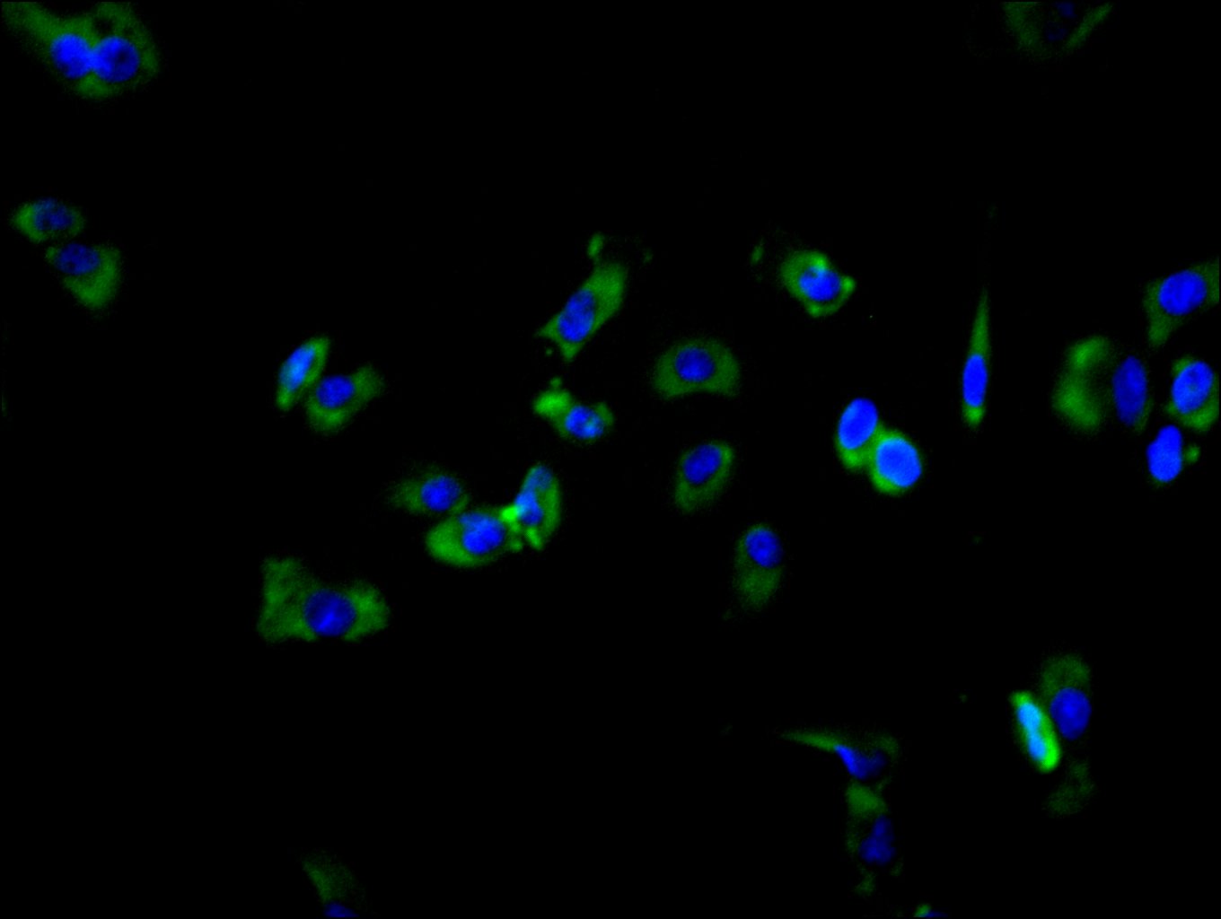 Immunofluorescence staining of HepG2 cell with CSB-RA164048A0HU at 1:50, counter-stained with DAPI. The cells were fixed in 4% formaldehyde and blocked in 10% normal Goat Serum. The cells were then incubated with the antibody overnight at 4°C. The secondary antibody was Alexa Fluor 488-congugated AffiniPure Goat Anti-Rabbit IgG(H+L).