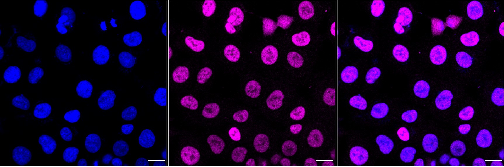 Immunocytochemical staining of HT-1080 cells with RUNX1/RUNX2/RUNX3 antibody. Nuclei were stained blue with DAPI; RUNX1/RUNX2/RUNX3 was stained magenta with Alexa Fluor? 647. Images were taken using Leica stellaris 5. Protein abundance based on laser Intensity and smart gain: Medium. Scale bar, 20 μm.