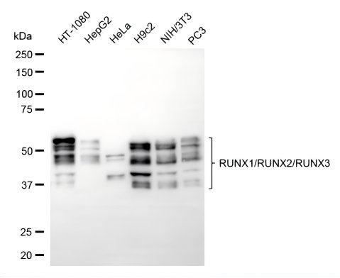 Western blotting analysis using RUNX1/RUNX2/RUNX3 antibody. Total cell lysates (30 μg) from various cell lines were loaded and separated by SDS-PAGE. The blot was incubated with RUNX1/RUNX2/RUNX3 antibody and HRP-conjugated goat anti-rabbit secondary antibody respectively.