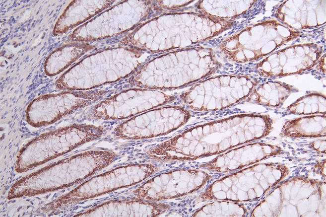 IHC image of CSB-RA249987A0HU diluted at 1:50 and staining in paraffin-embedded human rectal cancer performed on a Leica BondTM system. After dewaxing and hydration, antigen retrieval was mediated by high pressure in a citrate buffer (pH 6.0). Section was blocked with 10% normal goat serum 30min at RT. Then primary antibody (1% BSA) was incubated at 4°C overnight. The primary is detected by a Goat anti-rabbit polymer IgG labeled by HRP and visualized using 0.68% DAB.