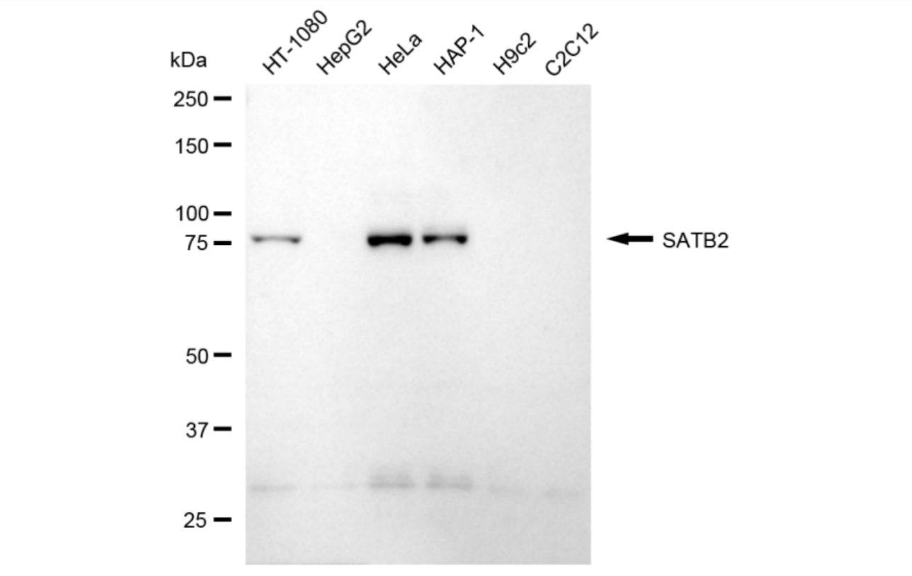Western blotting analysis using SATB2 antibody. Total cell lysates (30 μg) from various cell lines were loaded and separated by SDS-PAGE. The blot was incubated with SATB2 antibody and HRP-conjugated goat anti-rabbit secondary antibody respectively.
