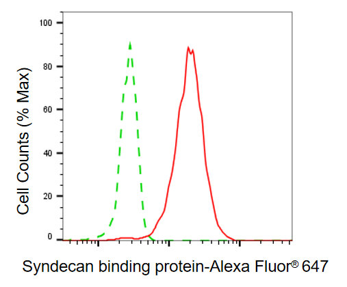 Flow cytometric analysis of syndecan binding protein expression in HepG2 cells using syndecan binding protein antibody. Green, isotype control; red, syndecan binding protein.