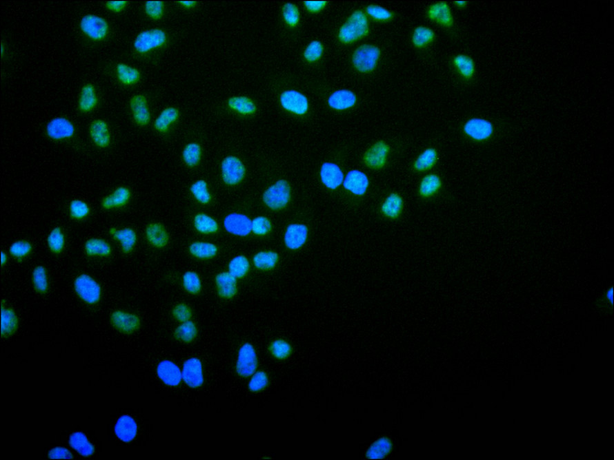 Immunofluorescence staining of Hela cell with CSB-RA124766A0HU at 1:50 , counter-stained with DAPI. The cells were fixed in 4% formaldehyde, permeabilized using 0.2% Triton X-100 and blocked in 10% normal Goat Serum. The cells were then incubated with the antibody overnight at 4°C. The secondary antibody was Alexa Fluor 488-congugated AffiniPure Goat Anti-Rabbit IgG(H+L).
