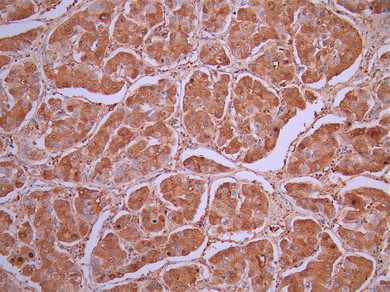 IHC image of CSB-RA548433A0HU diluted at 1:100 and staining in paraffin-embedded human liver cancer performed on a Leica BondTM system. After dewaxing and hydration, antigen retrieval was mediated by high pressure in a citrate buffer (pH 6.0). Section was blocked with 10% normal goat serum 30min at RT. Then primary antibody (1% BSA) was incubated at 4°C overnight. The primary is detected by a Goat anti-rabbit polymer IgG labeled by HRP and visualized using 0.05% DAB.