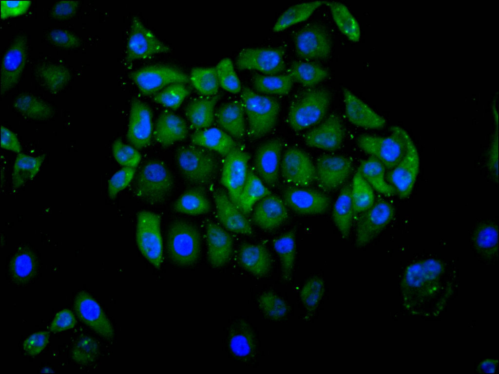 Immunofluorescence staining of Hela cell with CSB-RA056935A0HU at 1:50, counter-stained with DAPI. The cells were fixed in 4% formaldehyde, permeabilized using 0.2% Triton X-100 and blocked in 10% normal Goat Serum. The cells were then incubated with the antibody overnight at 4°C. The secondary antibody was Alexa Fluor 488-congugated AffiniPure Goat Anti-Rabbit IgG(H+L).