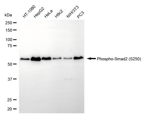 Western blotting analysis using phospho-Smad2 (S250) antibody. Total cell lysates (30 μg) from various cell lines were loaded and separated by SDS-PAGE. The blot was incubated with phospho-Smad2 (S250) antibody and HRP-conjugated goat anti-rabbit secondary antibody respectively.