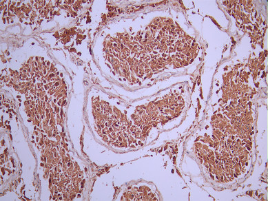 IHC image of CSB-RA252590A0HU diluted at 1:100 and staining in paraffin-embedded human testis tissue performed on a Leica BondTM system. After dewaxing and hydration, antigen retrieval was mediated by high pressure in a citrate buffer (pH 6.0). Section was blocked with 10% normal goat serum 30min at RT. Then primary antibody (1% BSA) was incubated at 4°C overnight. The primary is detected by a Goat anti-rabbit polymer IgG labeled by HRP and visualized using 0.05% DAB.