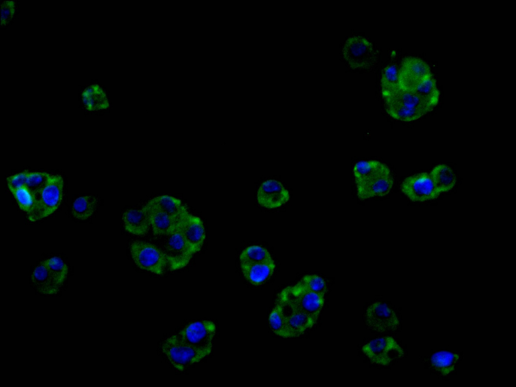 Immunofluorescence staining of HepG2 cell with CSB-RA047353A0HU at 1:50, counter-stained with DAPI. The cells were fixed in 4% formaldehyde and blocked in 10% normal Goat Serum. The cells were then incubated with the antibody overnight at 4°C. The secondary antibody was Alexa Fluor 488-congugated AffiniPure Goat Anti-Rabbit IgG(H+L).