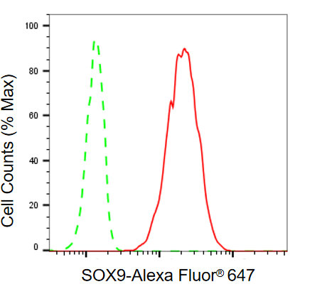 Flow cytometric analysis of SOX9 expression in HT-1080 cells using SOX9 antibody. Green, isotype control; red, SOX9.