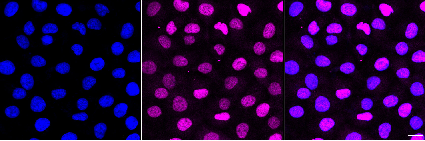 Immunocytochemical staining of HT-1080 cells with SOX9 antibody. Nuclei were stained blue with DAPI; SRY-Box Transcription Factor 9 was stained magenta with Alexa Fluor? 647. Images were taken using Leica stellaris 5. Protein abundance based on laser Intensity and smart gain: Medium. Scale bar, 20 μm.
