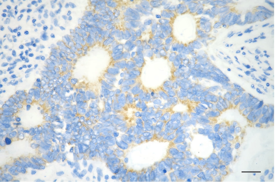 Immunohistochemistry was performed on paraffin-embedded human sigmoid colon carcinoma using stomatin like 2 antibody. Antigen retrieval was done in sodium citrate buffer (pH 6.0). DAB was used for detection, with hematoxylin counterstaining. Images were acquired using a Nikon Ci-L Plus microscope (40× objective). Scale bar: 25 μm.