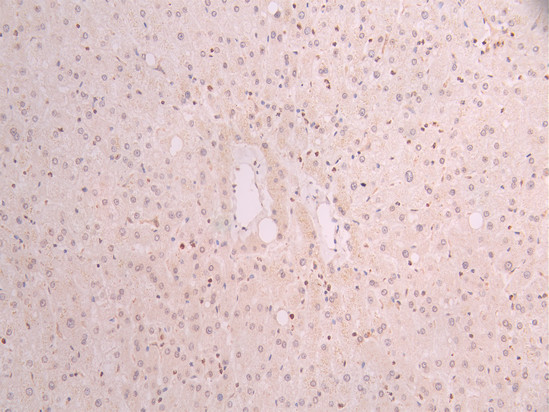 IHC image of CSB-RA084035A0HU diluted at 1:100 and staining in paraffin-embedded human liver tissue performed on a Leica BondTM system. After dewaxing and hydration, antigen retrieval was mediated by high pressure in a citrate buffer (pH 6.0). Section was blocked with 10% normal goat serum 30min at RT. Then primary antibody (1% BSA) was incubated at 4°C overnight. The primary is detected by a Goat anti-rabbit polymer IgG labeled by HRP and visualized using 0.05% DAB.