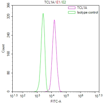 Overlay Peak curve showing jurkat cells stained with CSB-RA198357A0HU (red line) at 1:100. The cells were fixed in 4% formaldehyde and permeated by 0.2% TritonX-100 for 10min. Then 10% normal goat serum to block non-specific protein-protein interactions followed by the antibody (1ug/1*106cells) for 45min at 4℃. The secondary antibody used was FITC-conjugated goat anti-rabbit IgG (H+L) at 1/200 dilution for 35min at 4℃.Control antibody (green line) was Rabbit IgG (1ug/1*106cells) used under the same conditions. Acquisition of >10,000 events was performed.