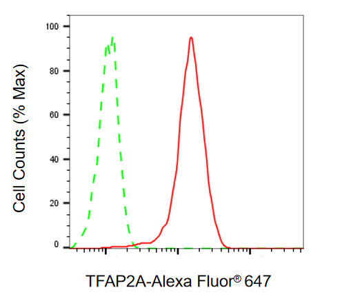 Flow cytometric analysis of TFAP2A expression in HepG2 cells using TFAP2A antibody. Green, isotype control; red, TFAP2A.