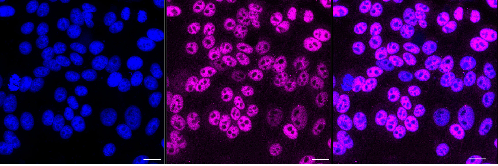 Immunocytochemical staining of HepG2 cells with TFAP2A antibody. Nuclei were stained blue with DAPI; TFAP2A was stained magenta with Alexa Fluor? 647. Images were taken using Leica stellaris 5. Protein abundance based on laser Intensity and smart gain: Medium. Scale bar, 20 μm.
