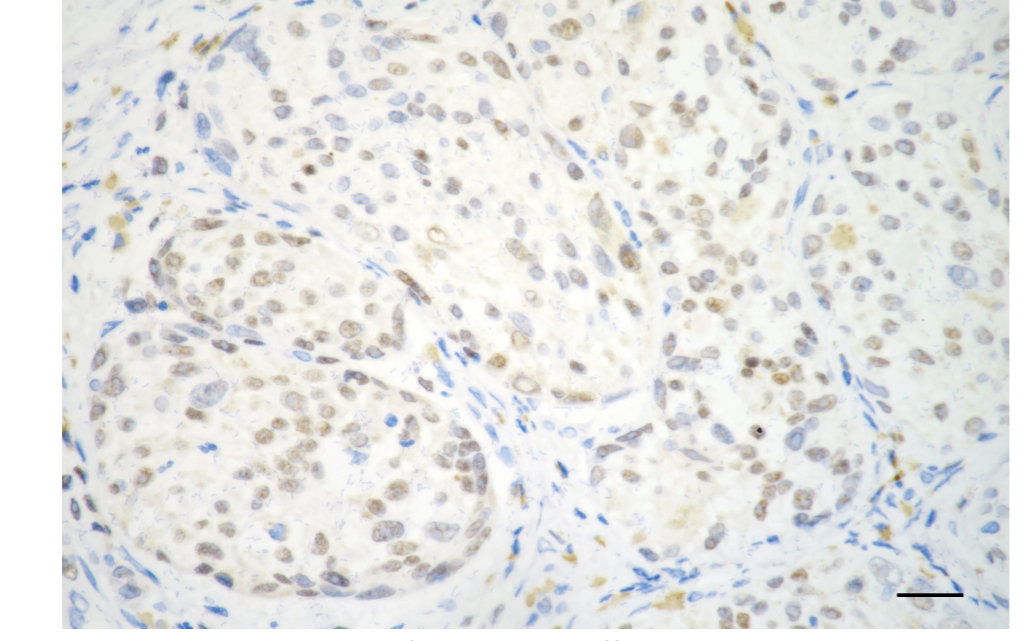 Immunohistochemistry was performed on paraffin-embedded human breast carcinoma using TFAP2A antibody. Antigen retrieval was done in sodium citrate buffer (pH 6.0). DAB was used for detection, with hematoxylin counterstaining. Images were acquired using a Nikon Ci-L Plus microscope (40× objective). Scale bar: 25 μm.