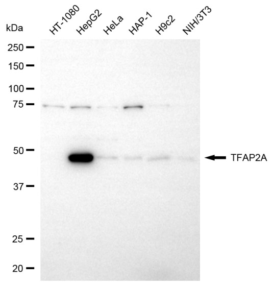 Western blotting analysis using TFAP2A antibody. Total cell lysates (30 μg) from various cell lines were loaded and separated by SDS-PAGE. The blot was incubated with TFAP2A antibody and HRP-conjugated goat anti-rabbit secondary antibody respectively.