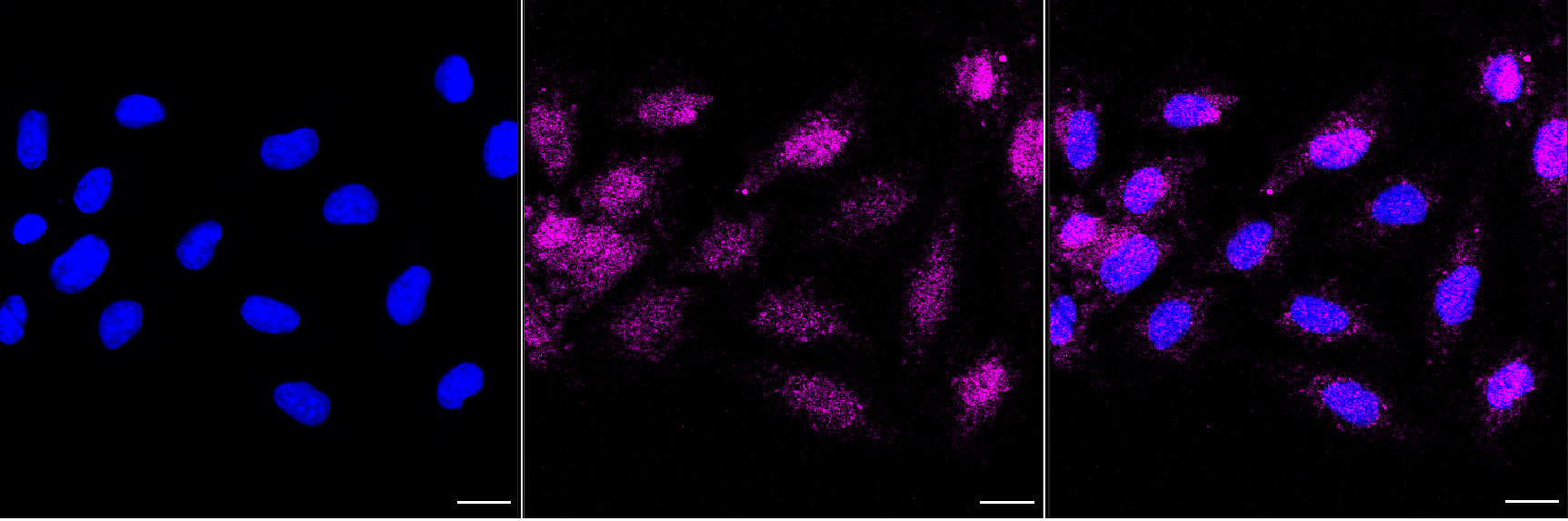 Immunocytochemical staining of H9c2 cells with TFE3 antibody. Nuclei were stained blue with DAPI; TFE3 was stained magenta with Alexa Fluor? 647. Images were taken using Leica stellaris 5. Protein abundance based on laser Intensity and smart gain: Medium. Scale bar, 20 μm.