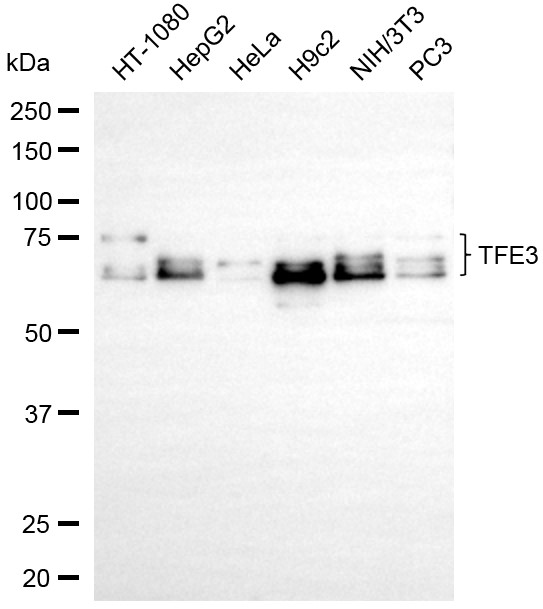 Western blotting analysis using TFE3 antibody. Total cell lysates (30 μg) from various cell lines were loaded and separated by SDS-PAGE. The blot was incubated with TFE3 antibody and HRP-conjugated goat anti-rabbit secondary antibody respectively.