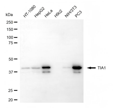 Western blotting analysis using TIA1 antibody. Total cell lysates (30 μg) from various cell lines were loaded and separated by SDS-PAGE. The blot was incubated with TIA1 antibody and HRP-conjugated goat anti-rabbit secondary antibody respectively.