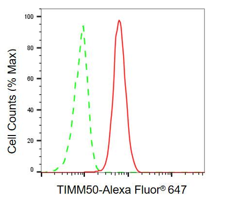Flow cytometric analysis of TIMM50 expression in HAP-1 cells using TIMM50 antibody. Green, isotype control; red, TIMM50.
