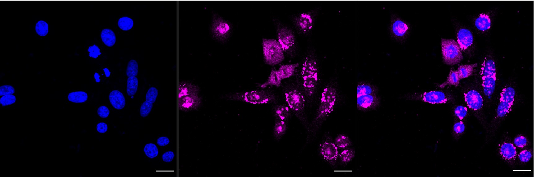 Immunocytochemical staining of HepG2 cells with TMF antibody. Nuclei were stained blue with DAPI; TMF was stained magenta with Alexa Fluor? 647. Images were taken using Leica stellaris 5. Protein abundance based on laser Intensity and smart gain: Medium. Scale bar, 20 μm.