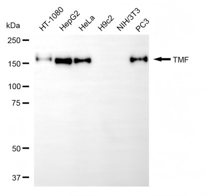 Western blotting analysis using TMF antibody. Total cell lysates (30 μg) from various cell lines were loaded and separated by SDS-PAGE. The blot was incubated with TMF antibody and HRP-conjugated goat anti-rabbit secondary antibody respectively.