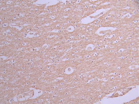 IHC image of CSB-RA903925A0HU diluted at 1:100 and staining in paraffin-embedded human brain tissue performed on a Leica BondTM system. After dewaxing and hydration, antigen retrieval was mediated by high pressure in a citrate buffer (pH 6.0). Section was blocked with 10% normal goat serum 30min at RT. Then primary antibody (1% BSA) was incubated at 4°C overnight. The primary is detected by a Goat anti-rabbit polymer IgG labeled by HRP and visualized using 0.05% DAB.