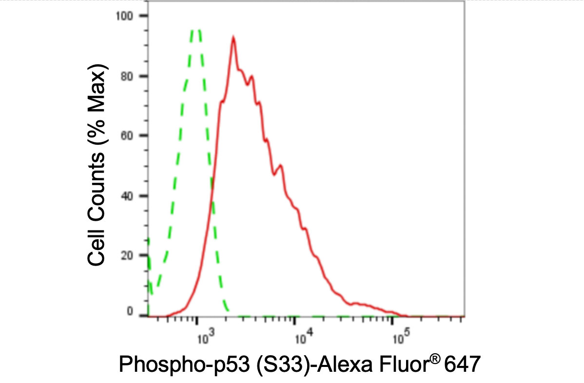 Flow cytometric analysis of phospho-p53 (S33) expression in HeLa cells using phospho-p53 (S33) antibody. Green, isotype control; red, phospho-p53 (S33).